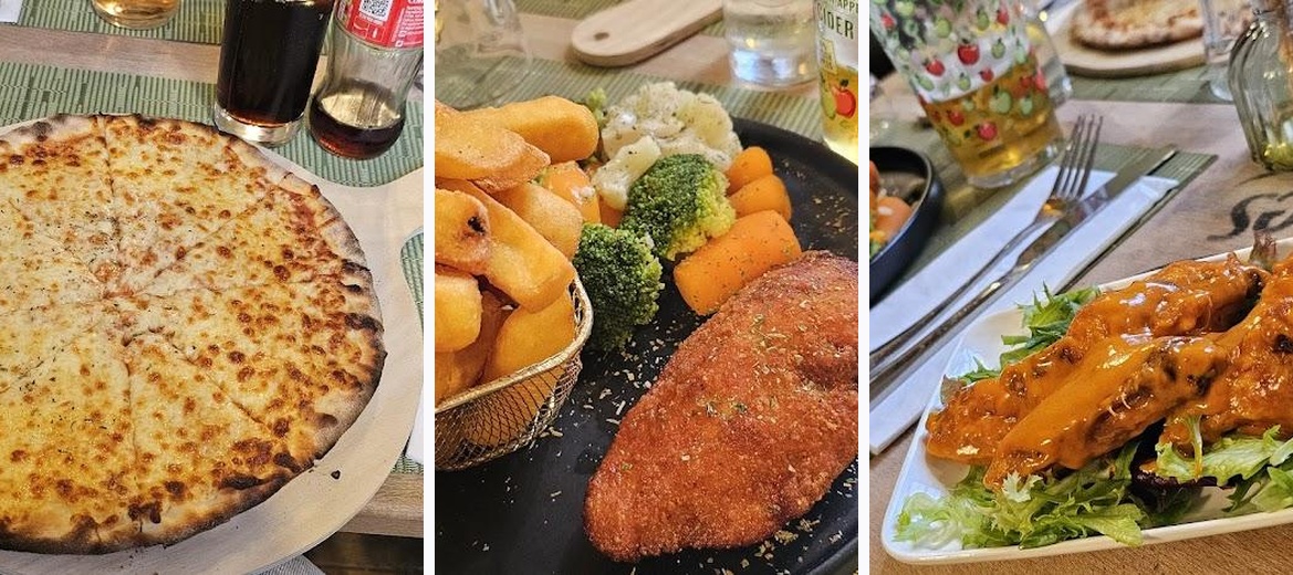 We have a amazing foods. We have 2 Margarita pizza, Buffalo chicken wings, Chiken Kiev with chips and a Home Beef Burger with fries and onion rings . All food is fresh made and tasty. We are completely full and definitely going back soon. Thank you 5⭐️